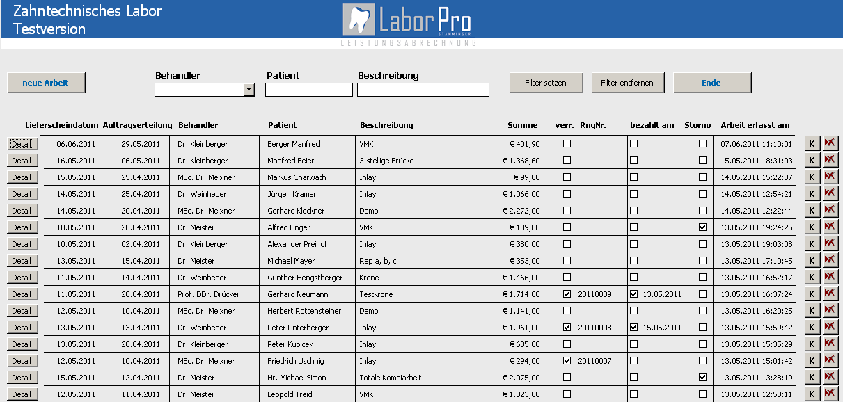 Einstieg in das Detailbild für jede Arbeit (verrechnet, bezahlt) |