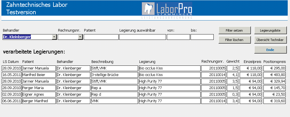 verarbeitete Legierungen - können für einzelne Behandler oder als Gesamtliste angezeigt